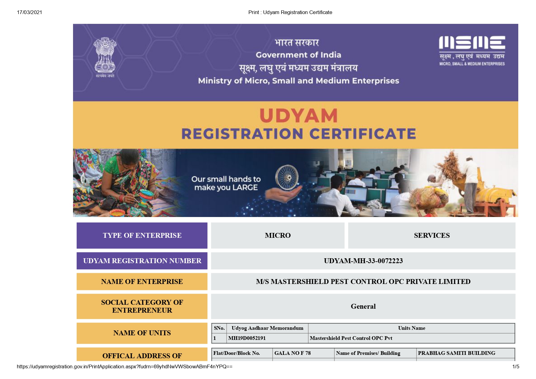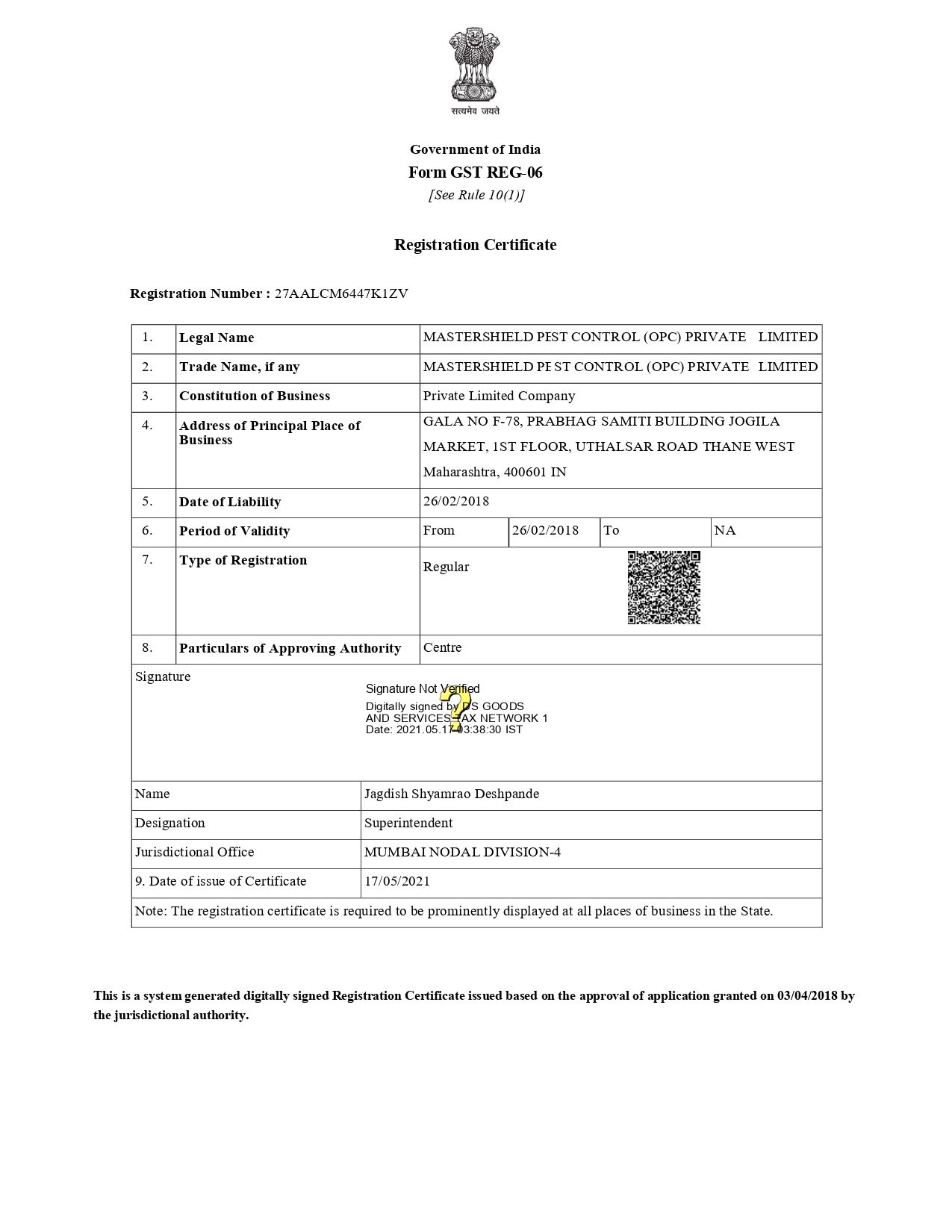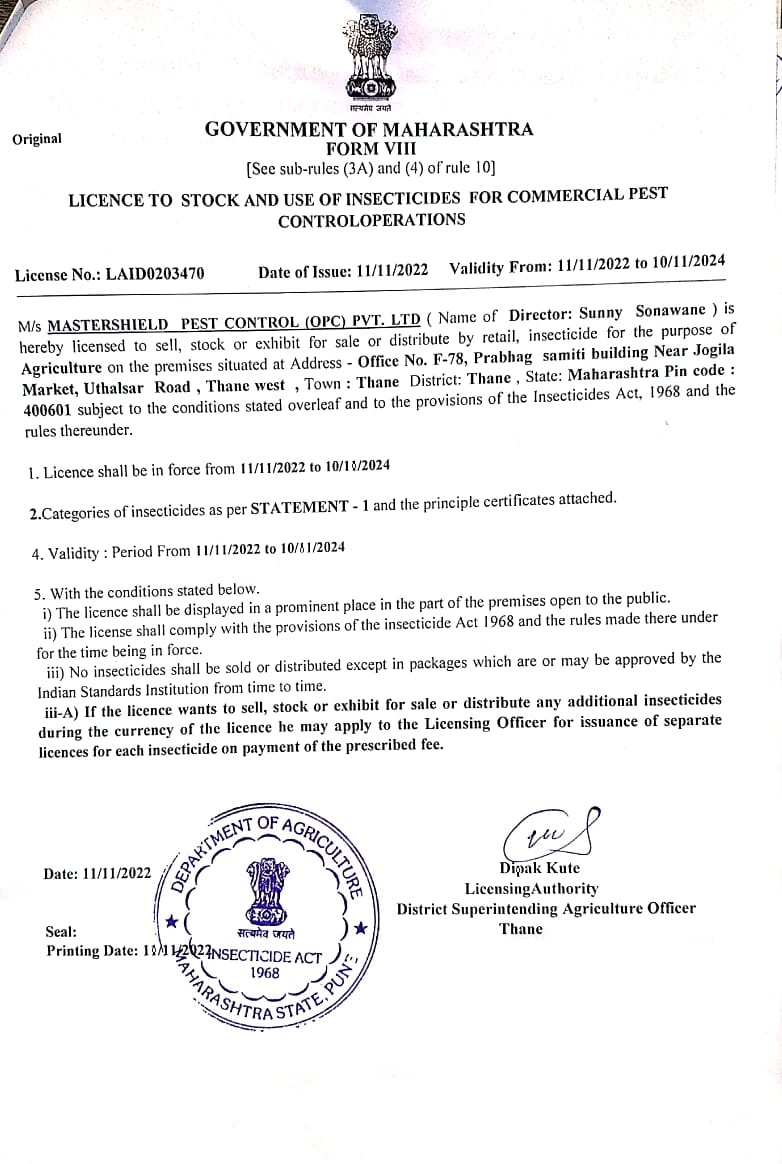 MASTER SHIELD PEST CONTROL (OPC)PVT.LTD Services is considered as a leading service provider in Mumbai. Dealing with the Pest Control and Rodent Control Service and other Termite Control and Bird Netting Services. We have been serving our clients since 2018. We use laboratory tested and clinically proven chemicals and pesticides to execute our services. Our offered range of services includes General Disinfestations Shield services, Wood Borer Shield services,